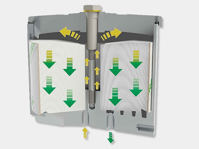 Acción del cartucho: El cartucho de filtración actúa tanto por absorción y adsorción en un proceso de reciclaje continuo. Las largas fibras del papel atraen el agua formada a través de ya sea el proceso de combustión o condensación y la absorben como una esponja, al mismo tiempo rechazan las grandes moléculas de aceite que se ven obligados a pasar entre los ajustados devanados del cartucho. A medida que el aceite pasa a través del cartucho, carbono diminuto, metales de desgaste, y las partículas de silicio se extraen del aceite mediante la adhesión a las superficies del filtro - un proceso conocido como adsorción. Así, el cartucho, mediante la eliminación de agua inhibe la producción de ácidos que tanto degradan el aceite y causan un desgaste excesivo.